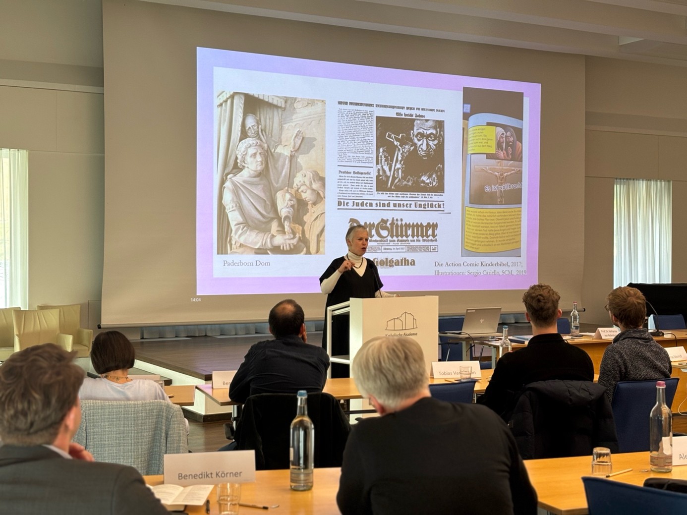 Am Nachmittag richtete Prof. em. Dr. Katharina von Kellenbach den Blick auf die Gegenwart religiöser Bildung. In ihrem Vortrag „Bildstörungen: Religion antisemitismuskritisch unterrichten“ analysierte sie tradierte Denkmuster und Bilder, die unbewusst antisemitische Stereotype fortschreiben können. Zugleich ermutigte sie zu einer reflektierten Unterrichtspraxis und zeigte an Beispielen aus der „Guten Nachricht – Geschichten von Jesus für Kinder fair erzählt“ (erschienen im Ariella-Verlag), wie ganz bewusst Verantwortung dafür übernommen werden kann, die christliche Botschaft nicht mit antijüdischen Anklängen und anderen Formen der Diskriminierung zu erzählen.